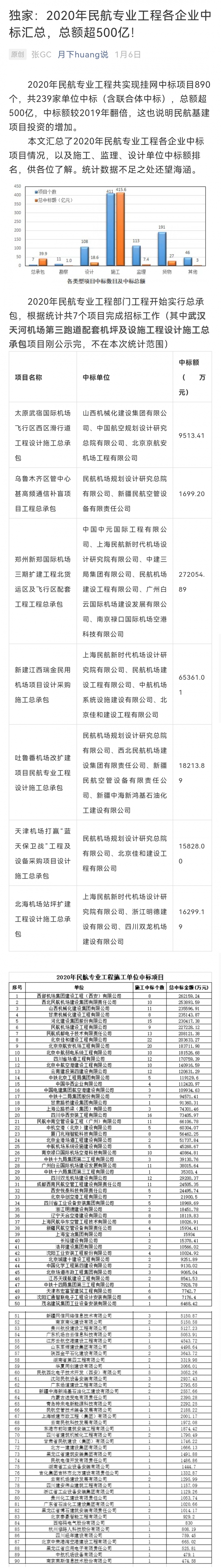 2020年民航專業(yè)工程共實(shí)現(xiàn)掛網(wǎng)中標(biāo)項(xiàng)目890個(gè),共239家單位中標(biāo)(含聯(lián)合體中標(biāo)),總額超500億。我公司民航專業(yè)工程中標(biāo)項(xiàng)目共8個(gè),中標(biāo)總金額235143.87萬元,位居全國第四。